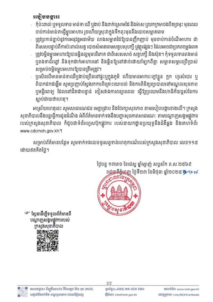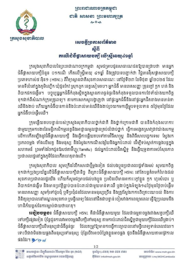 ភ្នំពេញ៖ ក្រសួងសុខាភិបាលសូមជម្រាបជូនសាធារណជនឱ្យបានជ្រាបថា មានអ្នកជំងឺផ្តាសាយបក្សីចំនួន ០១ករណី កើតលើស្ត្រីអាយុ ៤១ឆ្នាំ និងត្រូវបានបញ្ជាក់ថា វិជ្ជមានវីរុសផ្តាសាយបក្សី ប្រភេទហាស់៥ អ៊ុន១ (H5N1) ពីវិទ្យាស្ថានជាតិសុខភាពសាធារណៈ នៅថ្ងៃទី២៣ ខែមិថុនា ឆ្នាំ២០២៥ ដែល មានទីលំនៅក្នុងភូមិល្បើក ឃុំដូនកែវ ស្រុកពួក ខេត្តសៀមរាប។