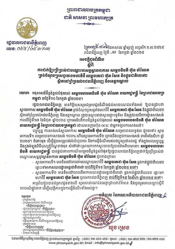 យោងតាមសេចក្តីជូនដំណឹងរបស់សាលារាជធានីភ្នំពេញបានឲ្យដឹងថា ស្ពានអាកាសសម្តេចធិបតី ហ៊ុន ម៉ាណែត នឹងដាក់ឱ្យប្រើប្រាស់ជាបណ្តោះអាសន្ន ត្រង់ចំណុចប្រសព្វរវាងមហាវិថី សម្តេចតេជោ ហ៊ុន សែន និងផ្លូវជាតិលេខ២ ស្ថិតនៅព្រំប្រទល់រាជធានីខេត្ត និងខេត្តកណ្តាល សម្រាប់លំហូរចរាចរទៅកាន់អាកាសយានដ្ឋានអន្តរជាតិតេជោ ចាប់ពីថ្ងៃទី១១ ខែកក្កដា ឆ្នាំ២០២៥ នេះតទៅ។