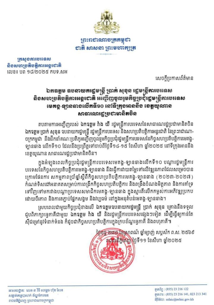 យោងតាមសេចក្តីប្រកាសព័ត៌មានចេញផ្សាយកាលពីថ្ងៃទី ១១ ខែសីហា ឆ្នាំ២០២៥បានឱ្យដឹង ថា តបតាមការអញ្ជើញរបស់ ឯកឧត្តម វ៉ាង យី រដ្ឋមន្ត្រីការបរទេសនៃសាធារណរដ្ឋប្រជាមានិតចិន ឯកឧត្តម ប្រាក់ សុខុន ឧបនាយករដ្ឋមន្ត្រី រដ្ឋមន្ត្រីការបរទេស និងសហប្រតិបត្តិការអន្តរជាតិ នៃព្រះរាជាណា ចក្រកម្ពុជា នឹងដឹកនាំគណៈប្រតិភូអញ្ជើញចូលរួមកិច្ចប្រជុំរដ្ឋមន្ត្រីការបរទេសនៃកិច្ចសហប្រតិបត្តិការមេគង្គ-ឡានឆាង លើកទី១០ ដែលនឹងប្រព្រឹត្តទៅចាប់ពីថ្ងៃទី១៤-១៥ ខែសីហា ឆ្នាំ២០២៥ នៅទីក្រុងអាននឹង ខេត្តយូណាន សាធារណរដ្ឋប្រជាមានិតចិន។