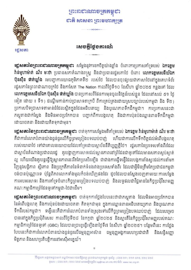 តាមរយៈសេចក្ដីថ្លែងការណ៍របស់រដ្ឋសភាកម្ពុជា បានគូសបញ្ជាក់ថា «រដ្ឋសភាកម្ពុជា សម្តែងនូវការខកចិត្តយ៉ាងខ្លាំង ចំពោះការប្រកាសគាំទ្ររបស់ លោក វ៉ាន់មូហាម៉ាត់ ណ័រមៈថា ប្រធានសភាតំណាងរាស្ត្រ និងជាប្រធានរដ្ឋសភាថៃ ចំពោះលោកឧត្តមសេនីយ៍ឯក ប៊ុនស៊ីន ផាត់ឃ្លាំង មេបញ្ជាការយោធភូមិភាគទី២ របស់ថៃ ដែលបានចុះផ្សាយជាភាសាថៃនៅក្នុងគេហទំព័រ រដ្ឋសភានៃព្រះរាជាណាចក្រថៃ និងកាសែត The Nation កាលពីថ្ងៃទី១០ ខែសីហា ឆ្នាំ២០២៥ កន្លងទៅ ដែលលោកឧត្តមសេនីយ៍ឯក ប៊ុនស៊ីន ផាត់ឃ្លាំង បានប្រកាសពីផែនការមុនចូលនិវត្តន៍របស់ខ្លួន ដែលនៅសល់ ៥១ ថ្ងៃទៀត»។