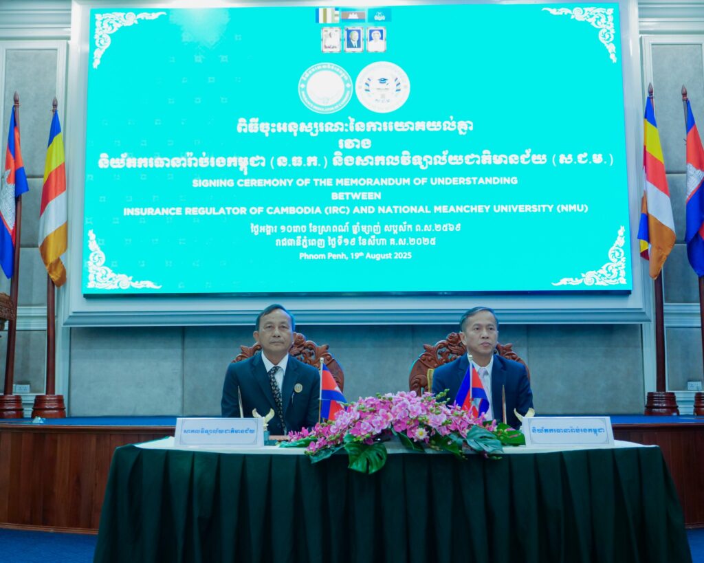 នាព្រឹកថ្ងៃទី១៩ ខែសិហា ឆ្នាំ២០២៥នេះ និយ័តករធានារ៉ាប់រងកម្ពុជា បានចាប់ដៃជាមួយ និងសាកលវិទ្យាល័យជាតិមានជ័យ ក្នុងគោលបំណងជំរុញការកសាងធនធានមនុស្ស ដើម្បីអភិវឌ្ឍវិស័យធានារ៉ាប់រង ប្រកបដោយចីរភាព តាមរយៈការបង្កើនសមត្ថភាពនិស្សិត និងលើកកម្ពស់ការយល់ដឹងស្តីពីការ ធានារ៉ាប់រងជាមូលដ្ឋាន ដែលអនុញ្ញាតឱ្យនិស្សិតត្រៀមខ្លួនរួចរាល់ក្នុងការចាប់យកឱកាសការងារ ក្នុងវិស័យធានារ៉ាប់រង ដែលកំពុងមានសក្តានុពល។