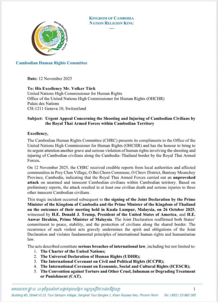 Phnom Penh: (13 November 2025): The Cambodian Human Rights Committee (CHRC) has sent a letter to the Office of the United Nations High Commissioner for Human Rights (OHCHR) to bring the urgent attention another grave and serious violation of human rights involving the shooting killed one Cambodian civilians and injured 3 others.