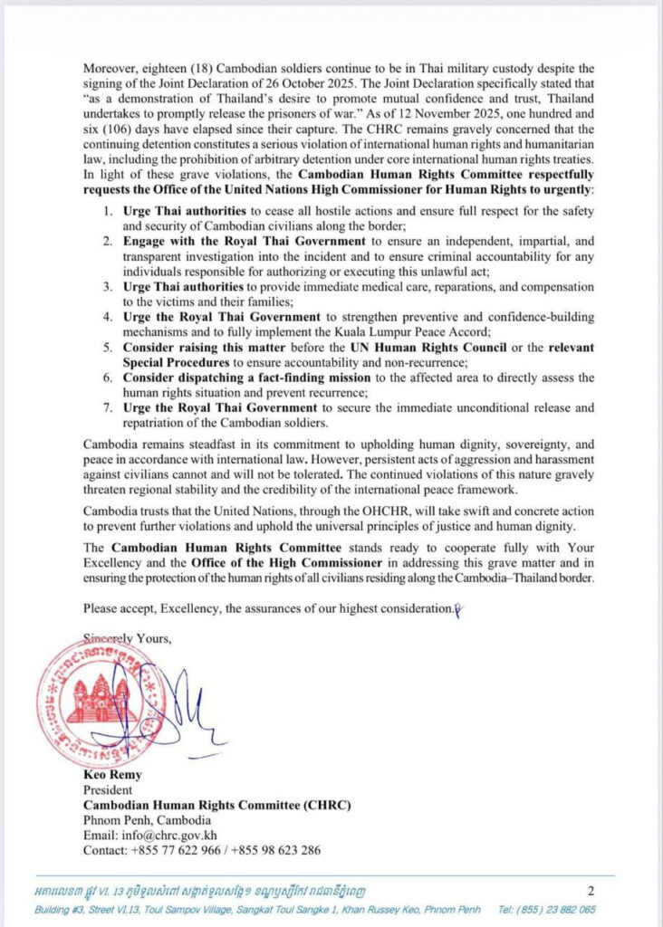 In a letter on Wednesday night addressing to Mr. Volker Turk, the Geneva-based OHCHR President, CHRC chairman Keo Remy said this tragic incident occurred subsequent to the singing of the Joint Declaration by both Cambodian and Thai Prime Ministers witnessed by Malaysian President Anwar Ibrahim and United States President Donald Trump in Kuala Lumpur on 26 October.