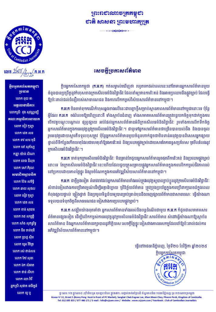 សេចក្តីប្រកាសព័ត៌មានរបស់ក្លិបអ្នកកាសែតកម្ពុជា