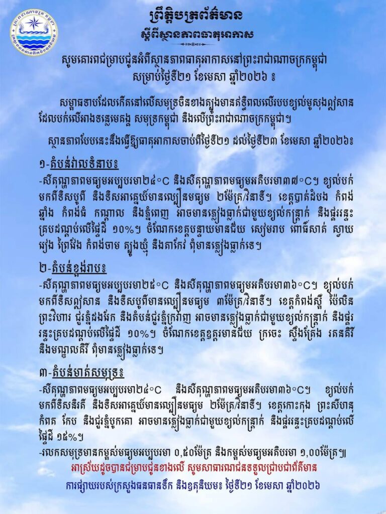 ស្ថានភាពធាតុអាកាសនៅព្រះរាជាណាចក្រកម្ពុជា សម្រាប់ថ្ងៃទី២១ ខែមេសា ឆ្នាំ២០២៦