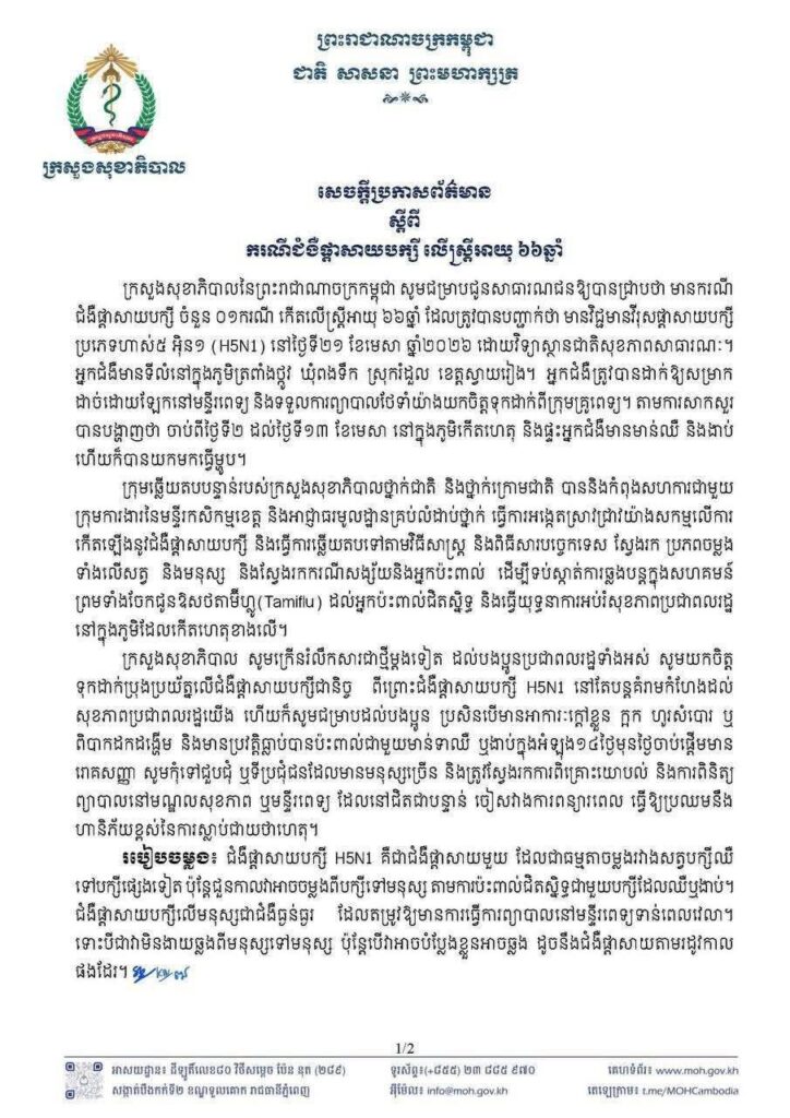 ស្វាយរៀង៖ ក្រសួងសុខាភិបាលសូមជម្រាបជូនសាធារណជនឱ្យបានជ្រាបថា មានករណី ជំងឺផ្តាសាយបក្សី ចំនួន ០១ករណី កើតលើស្ត្រីអាយុ ៦៦ឆ្នាំ ដែលត្រូវបានបញ្ជាក់ថា មានវិជ្ជមានវីរុសផ្តាសាយបក្សី ប្រភេទហាស់៥ អ៊ុន១ (H5N1) នៅថ្ងៃទី២១ ខែមេសា ឆ្នាំ២០២៦ ដោយវិទ្យាស្ថានជាតិសុខភាពសាធារណៈ។ អ្នកជំងឺមានទីលំនៅក្នុងភូមិត្រពាំងថ្កូវ ឃុំពងទឹក ស្រុករំដួល ខេត្តស្វាយរៀង។
