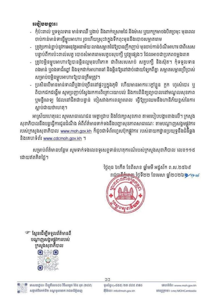 ក្រសួងសុខាភិបាល សូមក្រើនរំលឹកសារជាថ្មីម្ដងទៀត ដល់បងប្អូនប្រជាពលរដ្ឋទាំងអស់ សូមយកចិត្ត ទុកដាក់ប្រុងប្រយ័ត្នលើជំងឺផ្តាសាយបក្សីជានិច្ច ពីព្រោះជំងឺផ្តាសាយបក្សី H5N1 នៅតែបន្តគំរាមកំហែងដល់ សុខភាពប្រជាពលរដ្ឋយើង ហើយក៏សូមជម្រាបដល់បងប្អូន ប្រសិនបើមានអាការៈក្ដៅខ្លួន ក្អក ហូរសំបោរ ឬ ពិបាកដកដង្ហើម និងមានប្រវត្តិធ្លាប់បានប៉ះពាល់ជាមួយមាន់ទាឈឺ ឬងាប់ក្នុងអំឡុង១៤ថ្ងៃមុនថ្ងៃចាប់ផ្តើមមាន រោគសញ្ញា សូមកុំទៅជួបជុំ ឬទីប្រជុំជនដែលមានមនុស្សច្រើន និងត្រូវស្វែងរកការពិគ្រោះយោបល់ និងការពិនិត្យ ព្យាបាលនៅមណ្ឌលសុខភាព ឬមន្ទីរពេទ្យ ដែលនៅជិតជាបន្ទាន់ ចៀសវាងការពន្យារពេល ធ្វើឱ្យប្រឈមនឹង ហានិភ័យខ្ពស់នៃការស្លាប់ជាយថាហេតុ៕